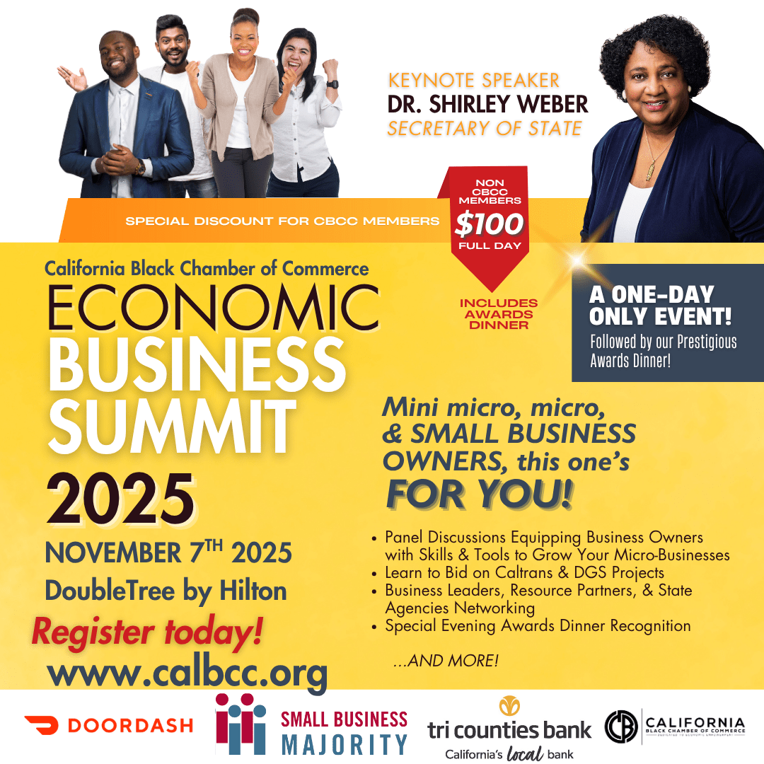 The California Black Chamber of Commerce presents the Economic Business Summit 2025—a one-day, high-impact convening for mini-micro, micro, and small business owners. Join us November 7, 2025 at the DoubleTree by Hilton Sacramento for expert panel discussions that equip entrepreneurs with practical skills and tools to grow, plus a focused session on how to bid on Caltrans and DGS projects. The day concludes with our Awards Dinner featuring a keynote by Dr. Shirley Weber, California Secretary of State. Registration: $100. Learn more and register at Calbcc.org.Images